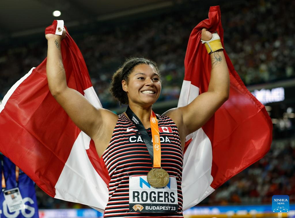 Camryn Rogers of Canada celebrates after winning the Women's Hammer Throw Final of the World Athletics Championships Budapest 2023 in Budapest, Hungary, Aug. 24, 2023. (Photo by Attila Volgyi/Xinhua)