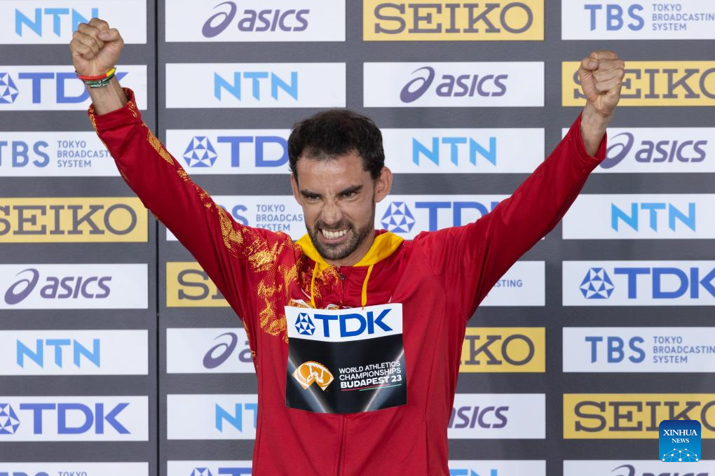 Gold medalist Alvaro Martin of Spain poses during the awarding ceremony for the Men's 35km Race Walk at the World Athletics Championships Budapest 2023 in Budapest, Hungary on Aug. 24, 2023. (Photo by Attila Volgyi/Xinhua)