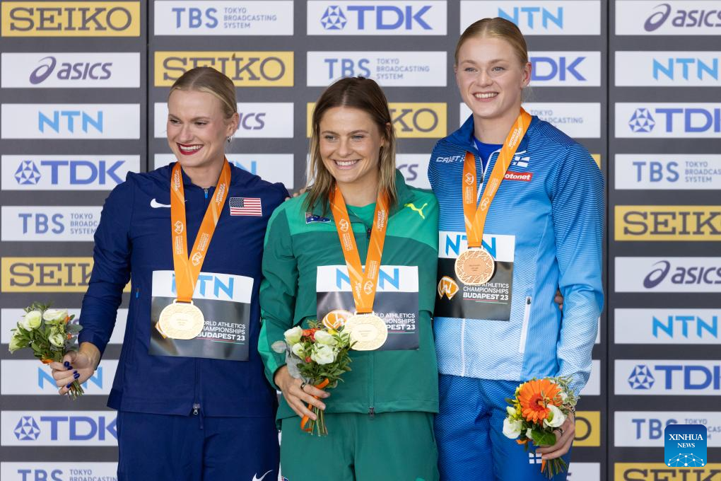 Gold medalists Katie Moon (L) of the United States, Nina Kennedy (C) of Australia and bronze medalist Wilma Murto of Finland attend the awarding ceremony for the Women's Pole Vault at the World Athletics Championships Budapest 2023 in Budapest, Hungary on Aug. 24, 2023. (Photo by Attila Volgyi/Xinhua)