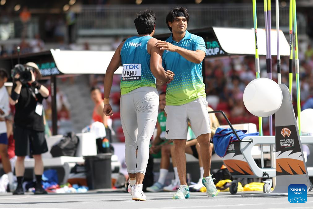 India's Neeraj Chopra (R) greets his compatriot D.P Manu during the men's javelin throw qualification of the World Athletics Championships Budapest 2023 in Budapest, Hungary, Aug. 25, 2023. (Xinhua/Li Ming)