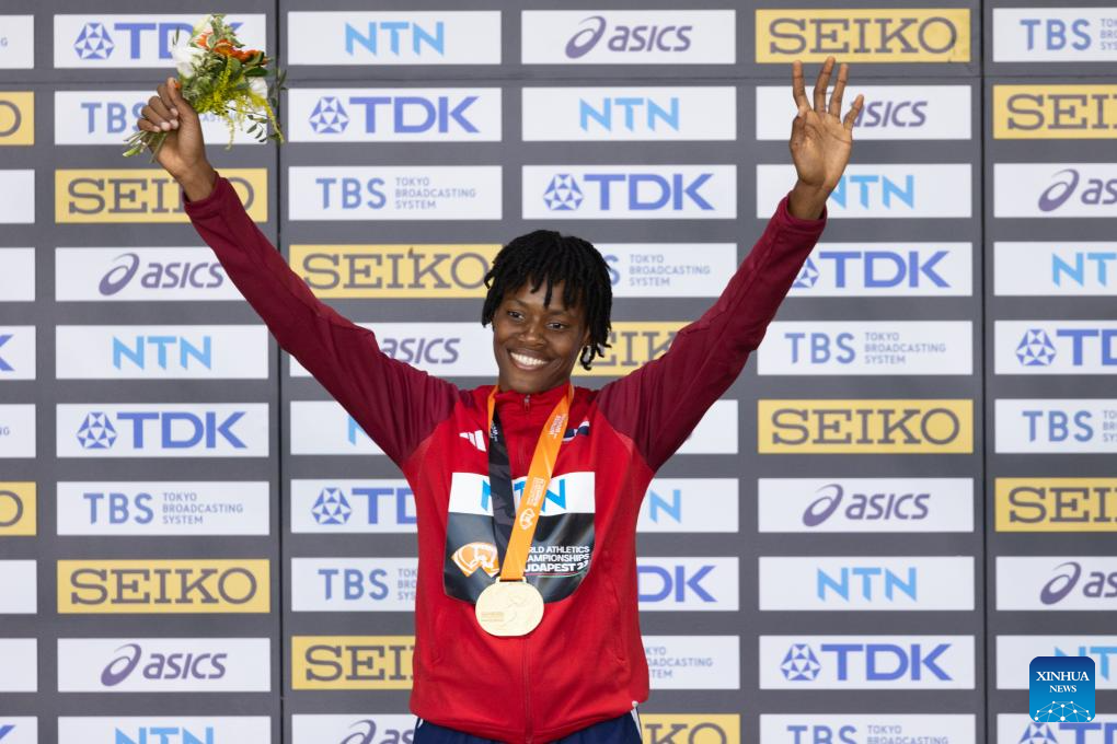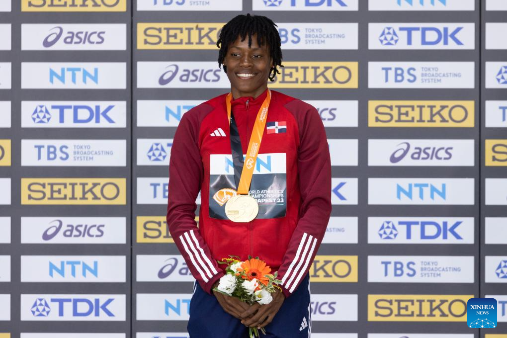 Gold medalist Marileidy Paulino of Dominican Republic poses during the awarding ceremony for the Women's 400m at the World Athletics Championships Budapest 2023 in Budapest, Hungary, on Aug. 24, 2023. (Photo by Attila Volgyi/Xinhua)