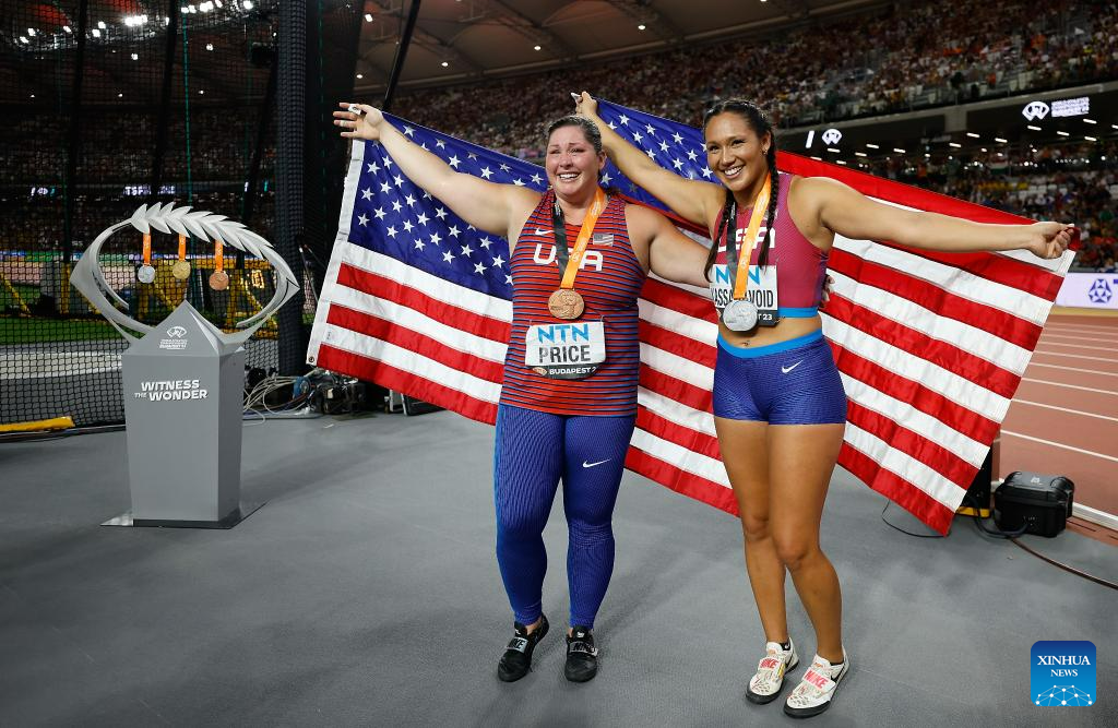 Janee' Kassanavoid (R) and DeAnna Price of the United States pose for pictures after the Women's Hammer Throw Final of the World Athletics Championships Budapest 2023 in Budapest, Hungary, Aug. 24, 2023. (Xinhua/Wang Lili)