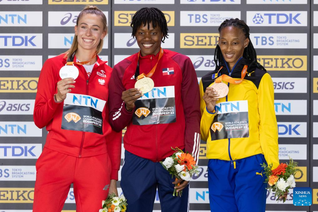 Sliver medalist Natalia Kaczmarek (L) of Poland, gold medalist Marileidy Paulino (C) of Dominican Republic and bronze medalist Sada Williams of Barbados attend the awarding ceremony for the Women's 400m at the World Athletics Championships Budapest 2023 in Budapest, Hungary, on Aug. 24, 2023. (Photo by Attila Volgyi/Xinhua)