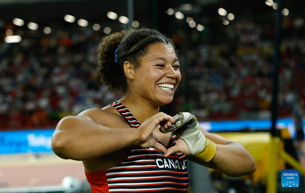 Camryn Rogers of Canada celebrates after winning the Women's Hammer Throw Final of the World Athletics Championships Budapest 2023 in Budapest, Hungary, Aug. 24, 2023. (Xinhua/Wang Lili)