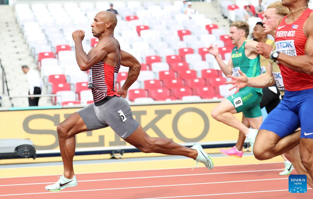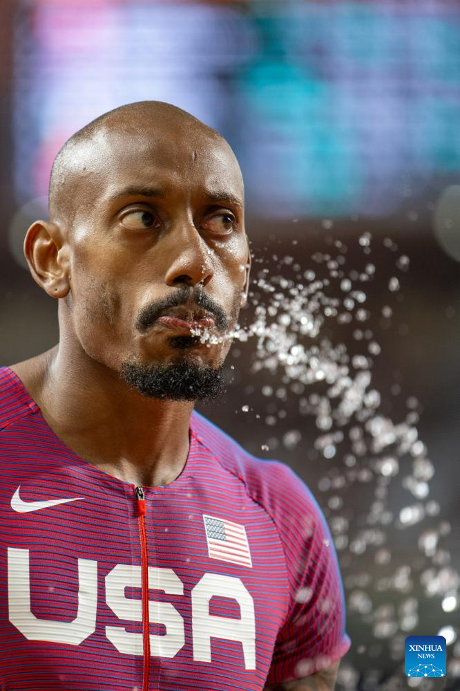 Vernon Norwood of the United States reacts ahead of the Men's 400m Final of the World Athletics Championships Budapest 2023 in Budapest, Hungary, Aug. 24, 2023. (Xinhua/Meng Dingbo)