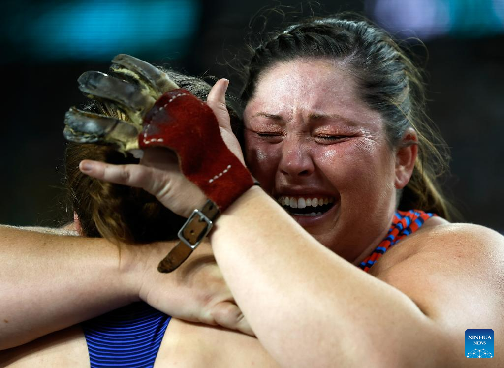 DeAnna Price (R) of the United States celebrates after her last attempt in the Women's Hammer Throw Final of the World Athletics Championships Budapest 2023 in Budapest, Hungary, Aug. 24, 2023. (Xinhua/Wang Lili)