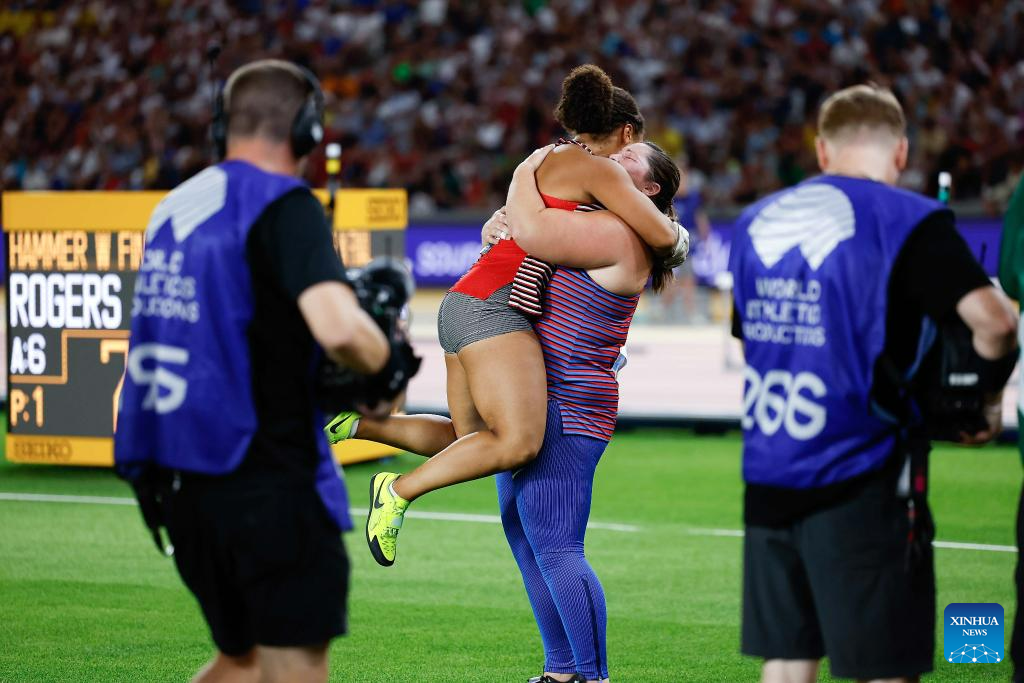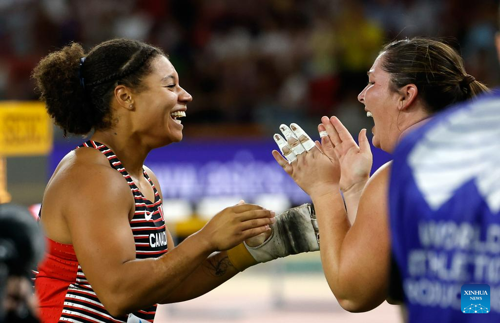Camryn Rogers (L) of Canada celebrates with DeAnna Price of the United States after the Women's Hammer Throw Final of the World Athletics Championships Budapest 2023 in Budapest, Hungary, Aug. 24, 2023. (Xinhua/Wang Lili)