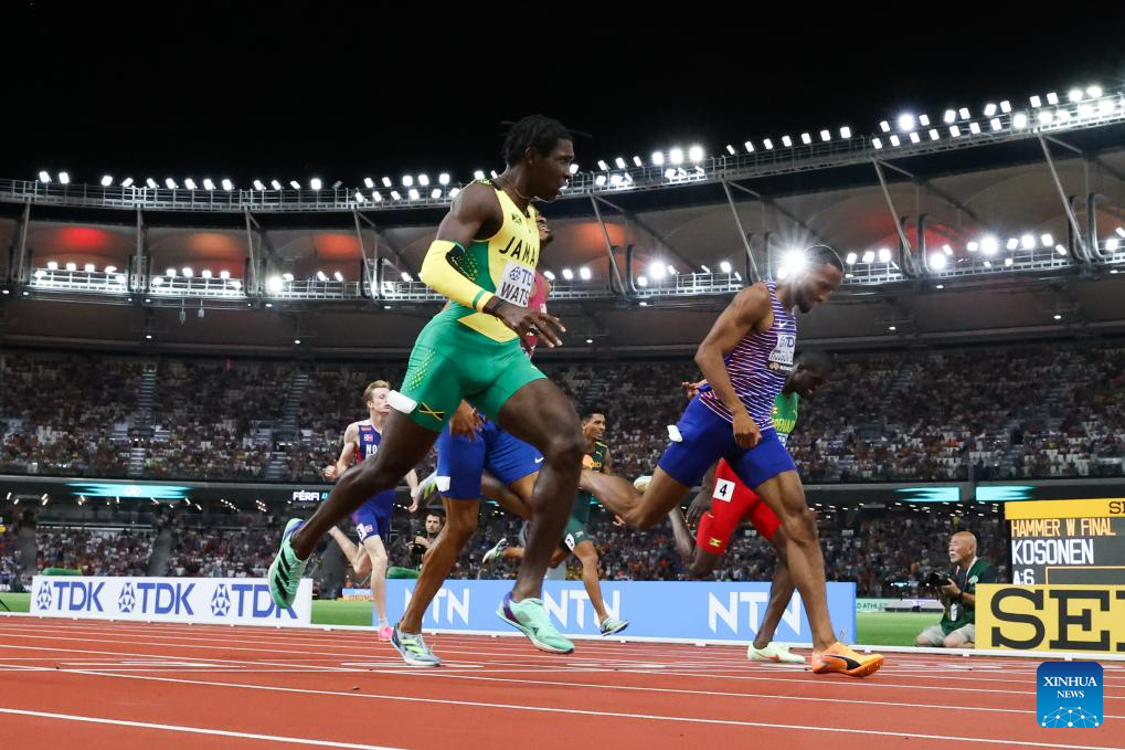 Antonio Watson (front L) of Jamaica crosses the finish line during the Men's 400m Final of the World Athletics Championships Budapest 2023 in Budapest, Hungary, Aug. 24, 2023. (Xinhua/Zheng Huansong)