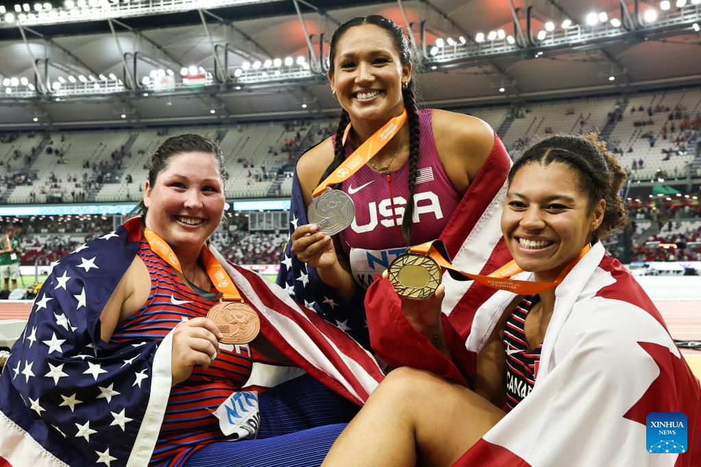 Camryn Rogers (R) of Canada, Janee' Kassanavoid (C) and DeAnna Price of the United States pose for photos after the Women's Hammer Throw Final of the World Athletics Championships Budapest 2023 in Budapest, Hungary, Aug. 24, 2023. (Xinhua/Zheng Huansong)