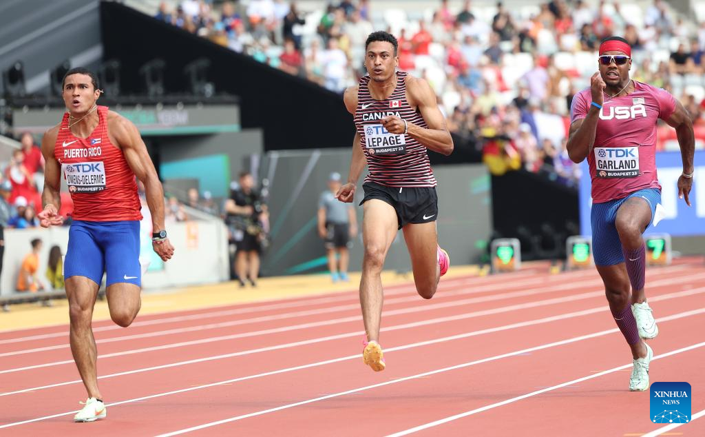 Canada's Pierce Lepage (C) competes during the decathlon 100m of the World Athletics Championships Budapest 2023 in Budapest, Hungary, Aug. 25, 2023. (Xinhua/Li Ming)