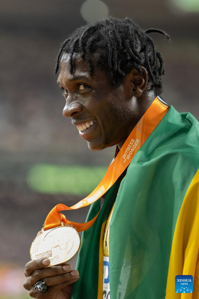 Gold medalist Antonio Watson of Jamaica displays his gold medal after the Men's 400m Final of the World Athletics Championships Budapest 2023 in Budapest, Hungary, Aug. 24, 2023. (Xinhua/Meng Dingbo)
