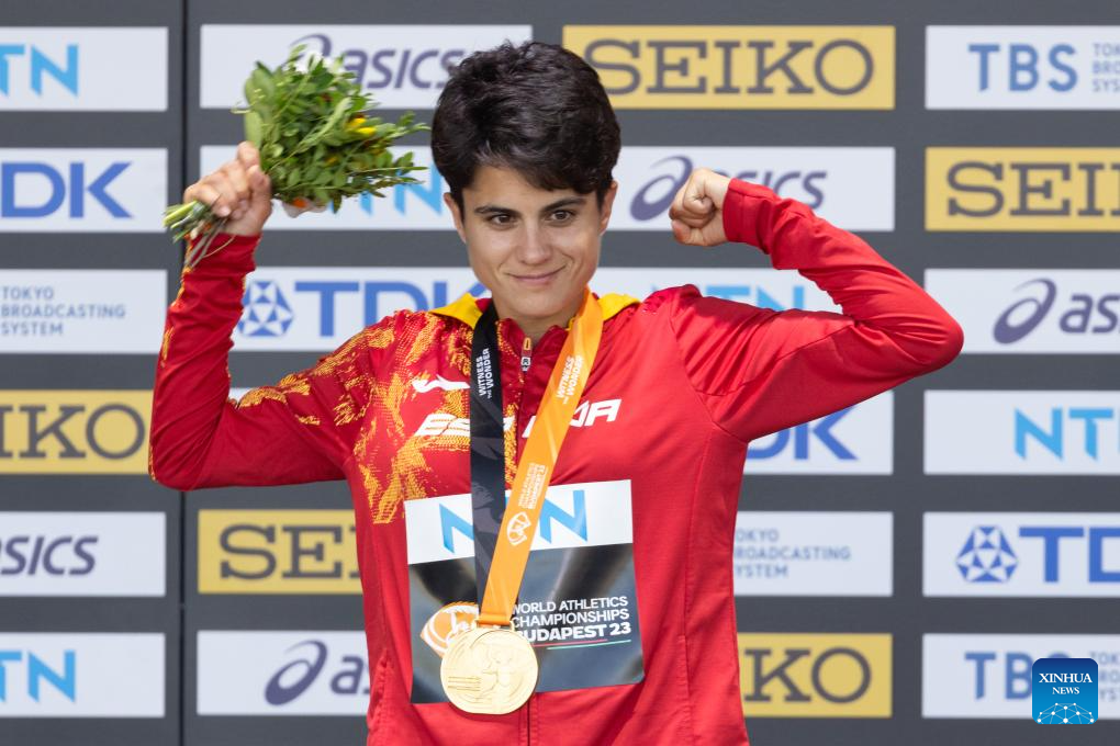 Gold medalist Maria Perez of Spain poses during the awarding ceremony for the Women's 35km Race Walk at the World Athletics Championships Budapest 2023 in Budapest, Hungary on Aug. 24, 2023. (Photo by Attila Volgyi/Xinhua)