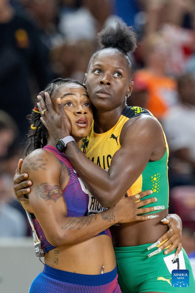 Sha'Carri Richardson (L) of the United States and Shericka Jackson of Jamaica react after the Women's 200m Semifinal of the World Athletics Championships Budapest 2023 in Budapest, Hungary, Aug. 24, 2023. (Xinhua/Zheng Huansong)