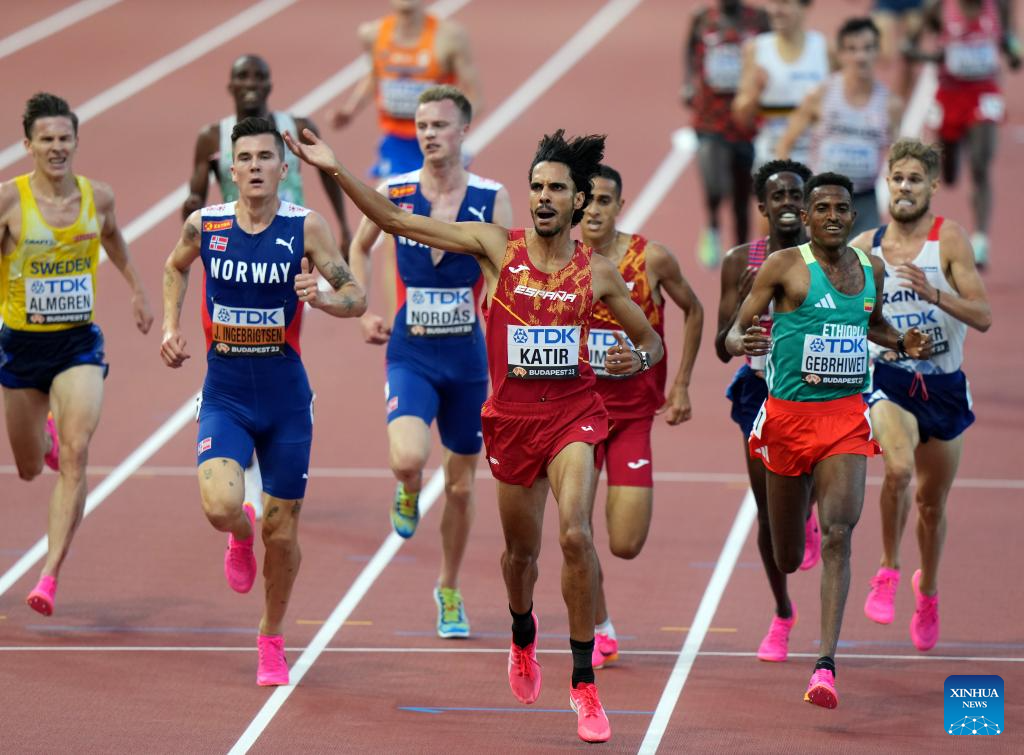 Mohamed Katir (front) of Spain celebrates as he crosses the finish line during the Men's 5000m heat of the World Athletics Championships Budapest 2023 in Budapest, Hungary, Aug. 24, 2023. (Xinhua/Li Ying)