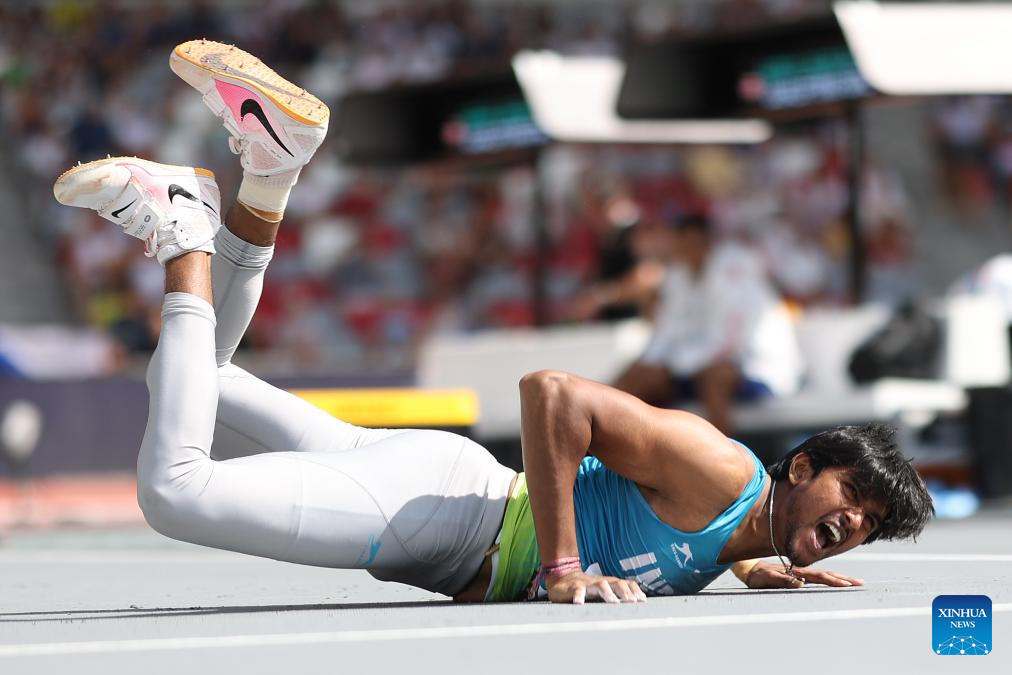 India's D.P Manu reacts after an attempt during the men's javelin throw qualification of the World Athletics Championships Budapest 2023 in Budapest, Hungary, Aug. 25, 2023. (Xinhua/Li Ming)