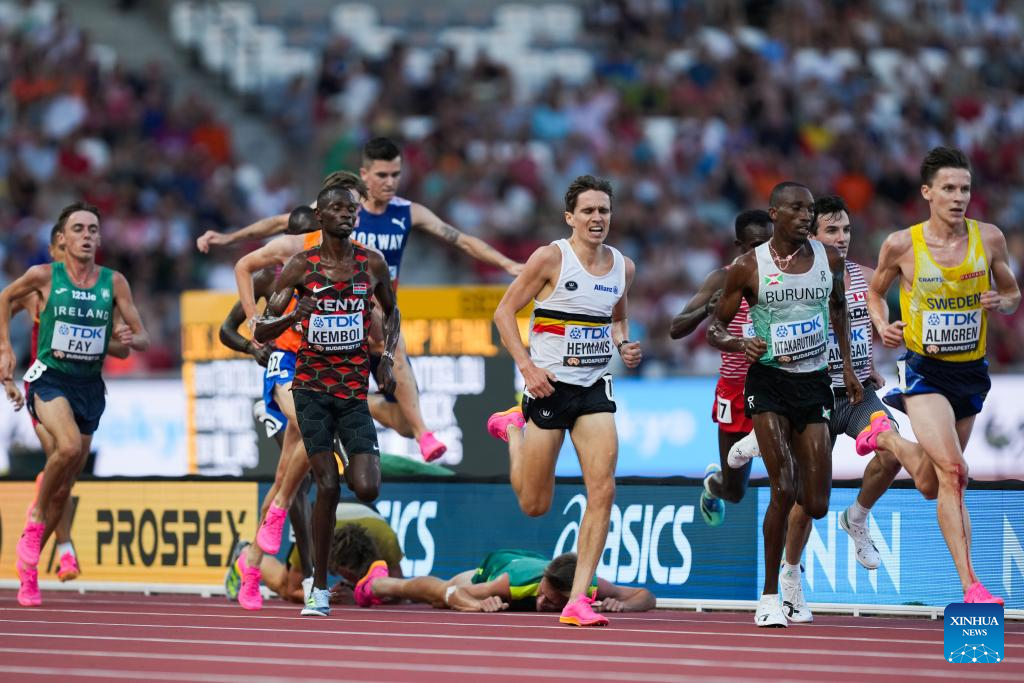 Stewart McSweyn (bottom R) of Australia and Sam Parsons (bottom L) of Germany fall during the Men's 5000m heat of the World Athletics Championships Budapest 2023 in Budapest, Hungary, Aug. 24, 2023. (Xinhua/Zheng Huansong)