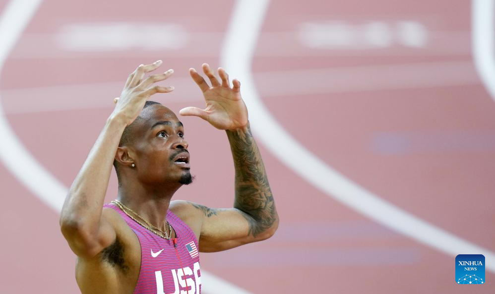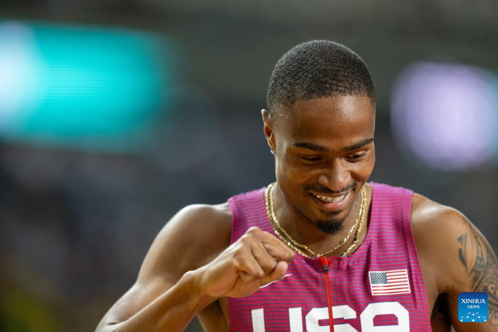 Quincy Hall of the United States reacts after the Men's 400m Final of the World Athletics Championships Budapest 2023 in Budapest, Hungary, Aug. 24, 2023. (Xinhua/Li Ying)