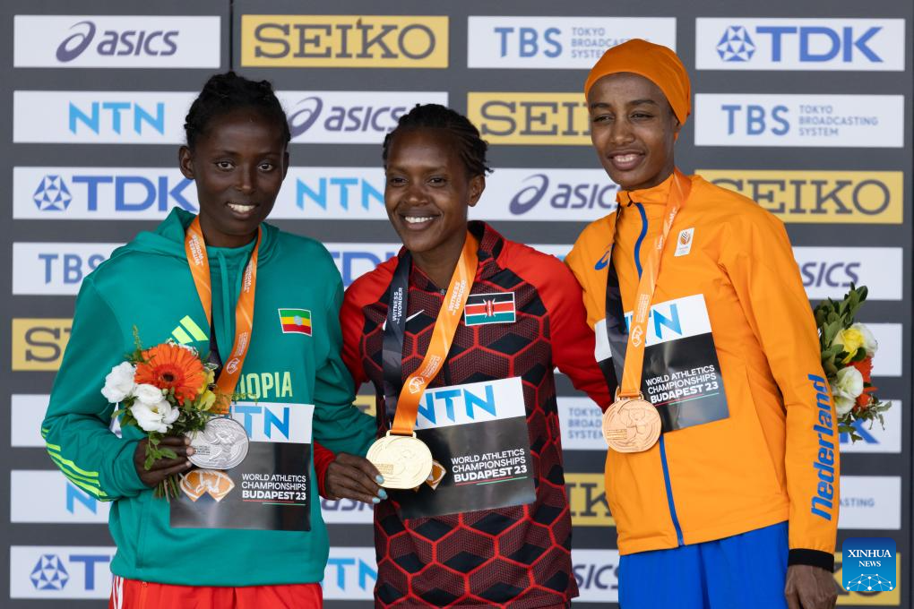 Silver medalist Diribe Welteji (L) of Ethiopia, gold medalist Faith Kipyegon (C) of Kenya and bronze medalist Sifan Hassan of the Netherlands attend the awarding ceremony for the Women's 1500 Meters at the World Athletics Championships Budapest 2023 in Budapest, Hungary on Aug. 24, 2023. (Photo by Attila Volgyi/Xinhua)