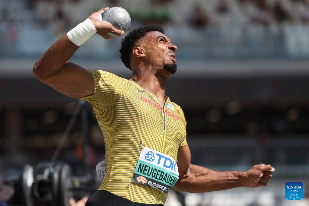 Germany's Leo Neugebauer competes during the decathlon shot put of the World Athletics Championships Budapest 2023 in Budapest, Hungary, Aug. 25, 2023. (Xinhua/Li Ming)