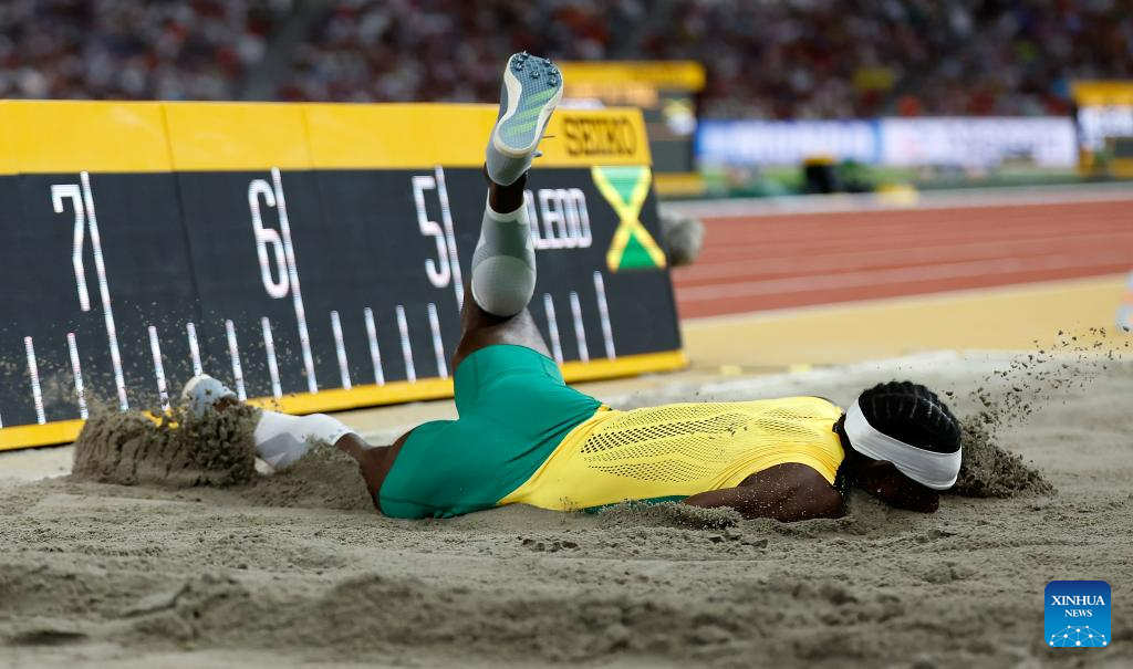 Carey McLeod of Jamaica falls in the sand during the Men's Long Jump Final of the World Athletics Championships Budapest 2023 in Budapest, Hungary, Aug. 24, 2023. (Xinhua/Wang Lili)