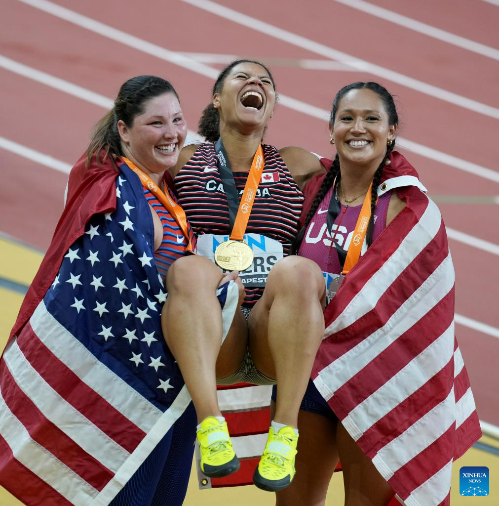 Camryn Rogers (C) of Canada, Janee' Kassanavoid (R) of and DeAnna Price of the United States celebrate after the Women's Hammer Throw Final of the World Athletics Championships Budapest 2023 in Budapest, Hungary, Aug. 24, 2023. (Xinhua/Li Ying)