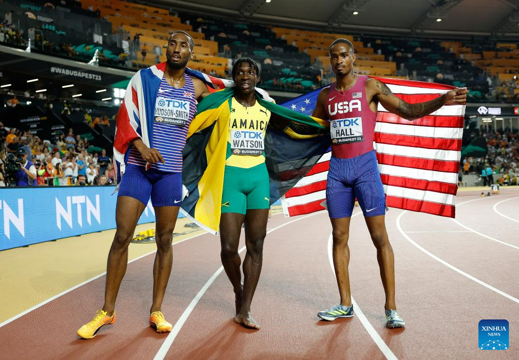 Gold medalist Antonio Watson (C) of Jamaica, silver medalist Quincy Hall (R) of the United States and bronze medalist Matthew Hudson-Smith of Britain pose after the Men's 400m Final of the World Athletics Championships Budapest 2023 in Budapest, Hungary, Aug. 24, 2023. (Xinhua/Wang Lili)