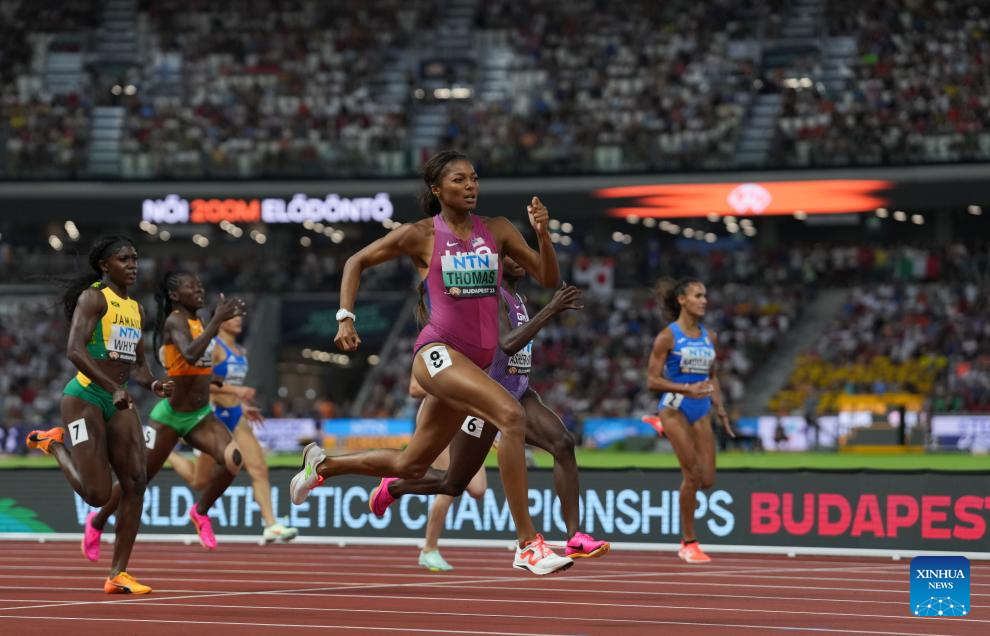 Gabrielle Thomas (C) of the United States competes during the Women's 200m Semifinal of the World Athletics Championships Budapest 2023 in Budapest, Hungary, Aug. 24, 2023. (Xinhua/Zheng Huansong)