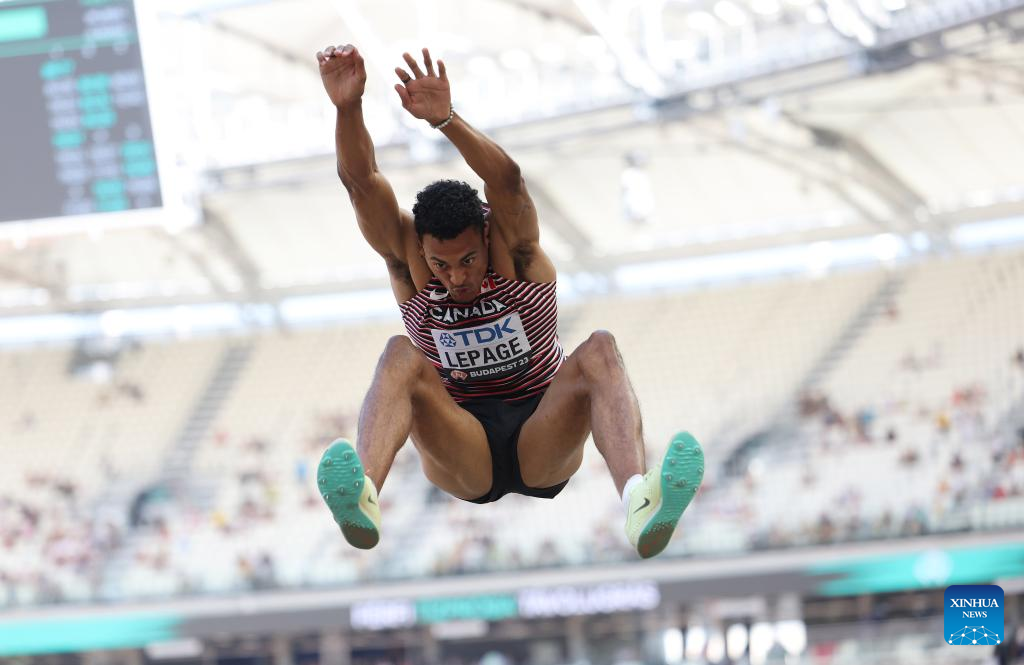 Canada's Pierce Lepage competes during the decathlon long jump of the World Athletics Championships Budapest 2023 in Budapest, Hungary, Aug. 25, 2023. (Xinhua/Li Ming)
