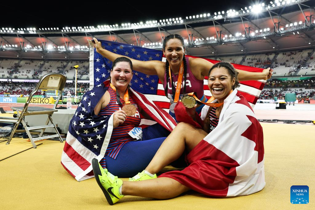 Camryn Rogers (R) of Canada, Janee' Kassanavoid (C) of the United States and DeAnna Price of the United States pose for photos after the Women's Hammer Throw Final of the World Athletics Championships Budapest 2023 in Budapest, Hungary, Aug. 24, 2023. (Xinhua/Zheng Huansong)