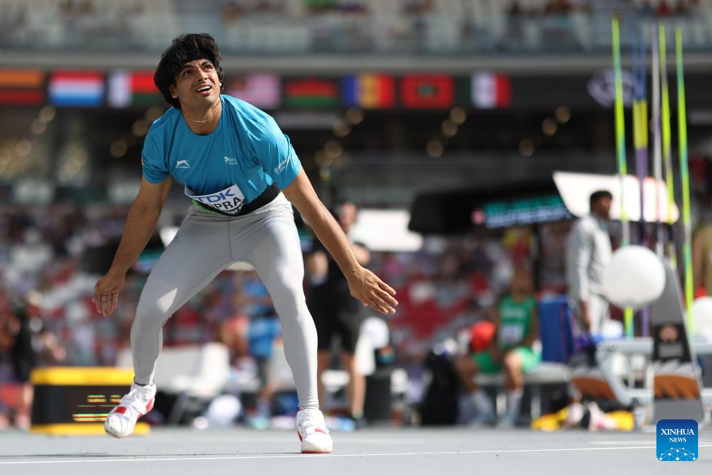 India's Neeraj Chopra competes during the men's javelin throw qualification of the World Athletics Championships Budapest 2023 in Budapest, Hungary, Aug. 25, 2023. (Xinhua/Li Ming)