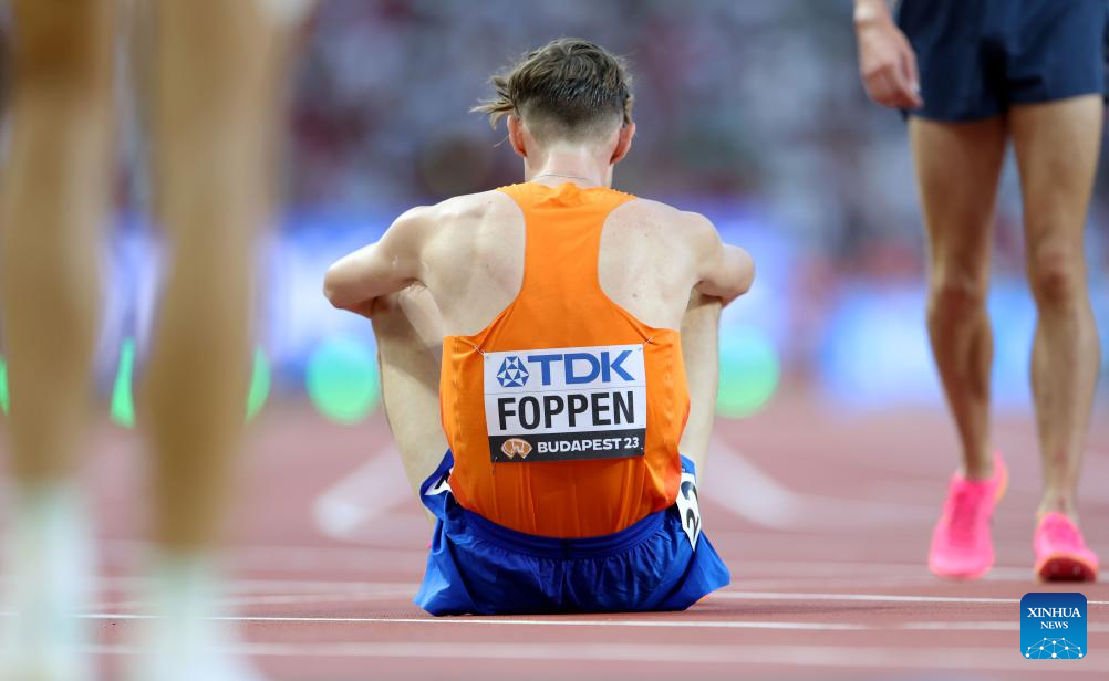 Mike Foppen of the Netherlands sits on the track after the Men's 5000m heat of the World Athletics Championships Budapest 2023 in Budapest, Hungary, Aug. 24, 2023. (Xinhua/Li Ming)