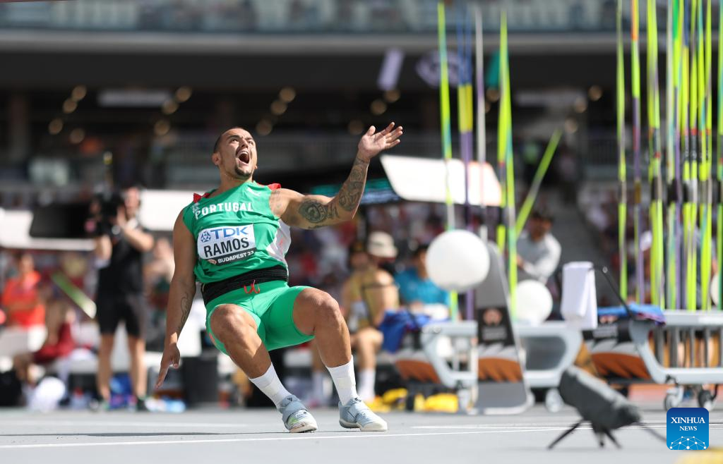 Portugal's Leandro Ramos reacts after an attempt during the men's javelin throw qualification of the World Athletics Championships Budapest 2023 in Budapest, Hungary, Aug. 25, 2023. (Xinhua/Li Ming)