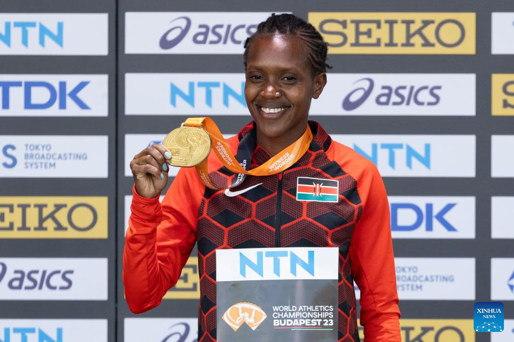 Gold medalist Faith Kipyegon of Kenya poses during the awarding ceremony for the Women's 1500 Meters at the World Athletics Championships Budapest 2023 in Budapest, Hungary on Aug. 24, 2023. (Photo by Attila Volgyi/Xinhua)