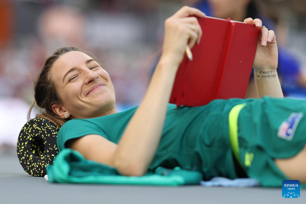 Eleanor Patterson of Australia reads notes during the women's high jump qualification of the World Athletics Championships Budapest 2023 in Budapest, Hungary, Aug. 25, 2023. (Xinhua/Li Ming)