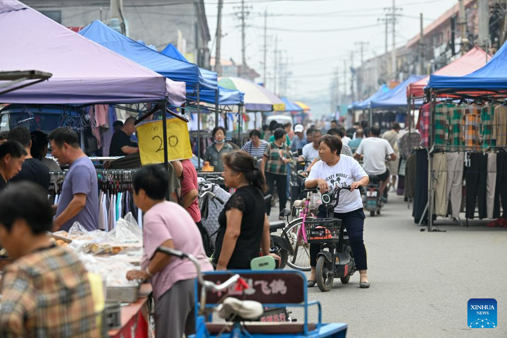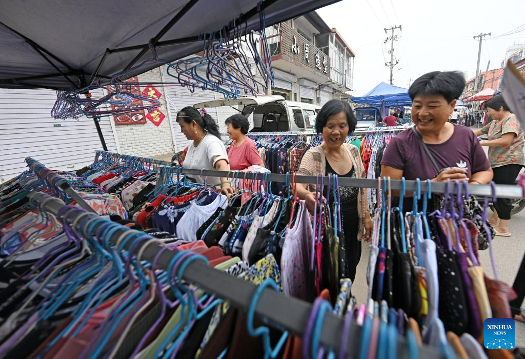 Villagers select goods at a rural fair in Taitou Town of Jinghai District in north China's Tianjin Municipality, Aug. 25, 2023. Taitou Town on Friday held the first large-scale rural fair after flood-affected villagers returned to their homes from temporary resettlement sites. The living order here is gradually restoring. (Xinhua/Sun Fanyue)