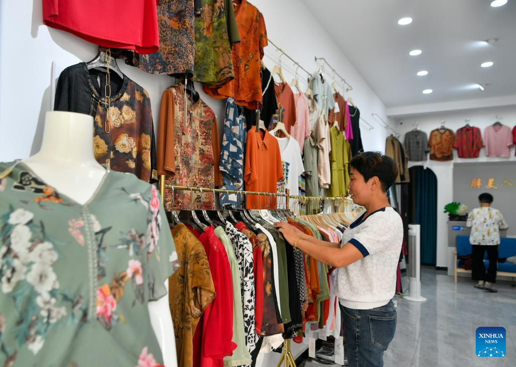 A villager selects clothes at a rural fair in Taitou Town of Jinghai District in north China's Tianjin Municipality, Aug. 25, 2023. Taitou Town on Friday held the first large-scale rural fair after flood-affected villagers returned to their homes from temporary resettlement sites. The living order here is gradually restoring. (Xinhua/Sun Fanyue)