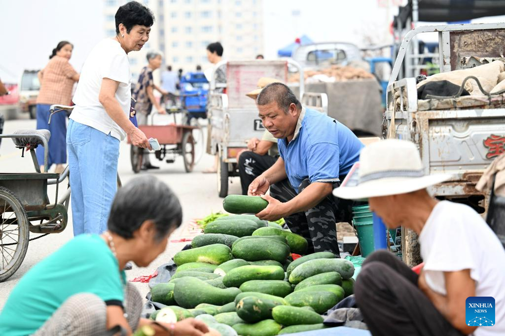 Villagers select vegetables at a rural fair in Taitou Town of Jinghai District in north China's Tianjin Municipality, Aug. 25, 2023. Taitou Town on Friday held the first large-scale rural fair after flood-affected villagers returned to their homes from temporary resettlement sites. The living order here is gradually restoring. (Xinhua/Zhao Zishuo)
