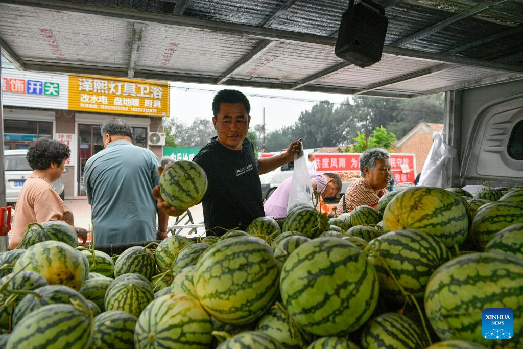 A vendor picks out watermelons for villagers at a rural fair in Taitou Town of Jinghai District in north China's Tianjin Municipality, Aug. 25, 2023. Taitou Town on Friday held the first large-scale rural fair after flood-affected villagers returned to their homes from temporary resettlement sites. The living order here is gradually restoring. (Xinhua/Sun Fanyue)