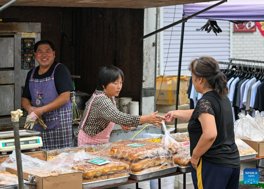 A villager buys goods at a rural fair in Taitou Town of Jinghai District in north China's Tianjin Municipality, Aug. 25, 2023. Taitou Town on Friday held the first large-scale rural fair after flood-affected villagers returned to their homes from temporary resettlement sites. The living order here is gradually restoring. (Xinhua/Sun Fanyue)