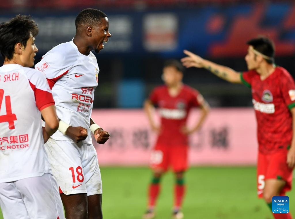 Luca Joao (2nd L) of Shanghai Port celebrates scoring during a 2023 season Chinese Football Association Super League (CSL) match between Henan FC and Shanghai Port in Zhengzhou, central China's Henan Province, Aug. 25, 2023. (Xinhua/Li Jianan)