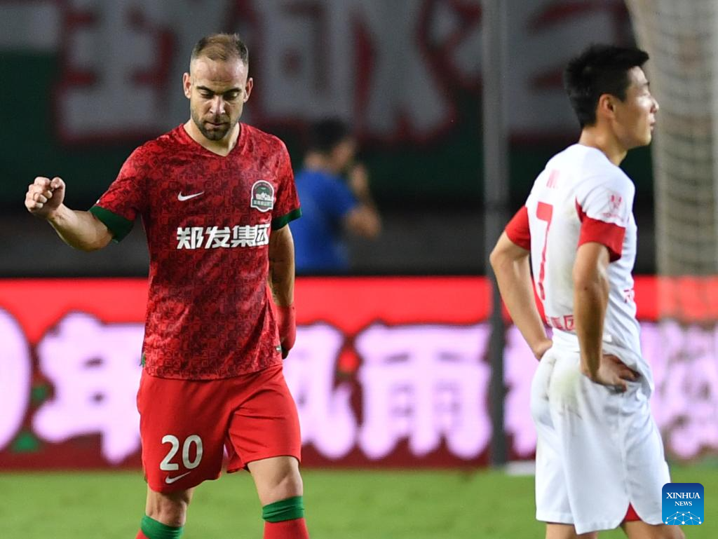 Nemanja Covic of Henan FC celebrates scoring during a 2023 season Chinese Football Association Super League (CSL) match between Henan FC and Shanghai Port in Zhengzhou, central China's Henan Province, Aug. 25, 2023. (Xinhua/Li Jianan)