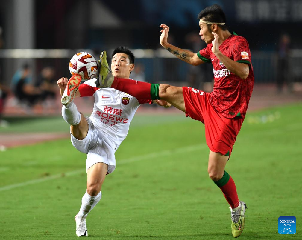Wu Lei (L) of Shanghai Port vies with Gu Cao of Henan FC during a 2023 season Chinese Football Association Super League (CSL) match between Henan FC and Shanghai Port in Zhengzhou, central China's Henan Province, Aug. 25, 2023. (Xinhua/Li Jianan)
