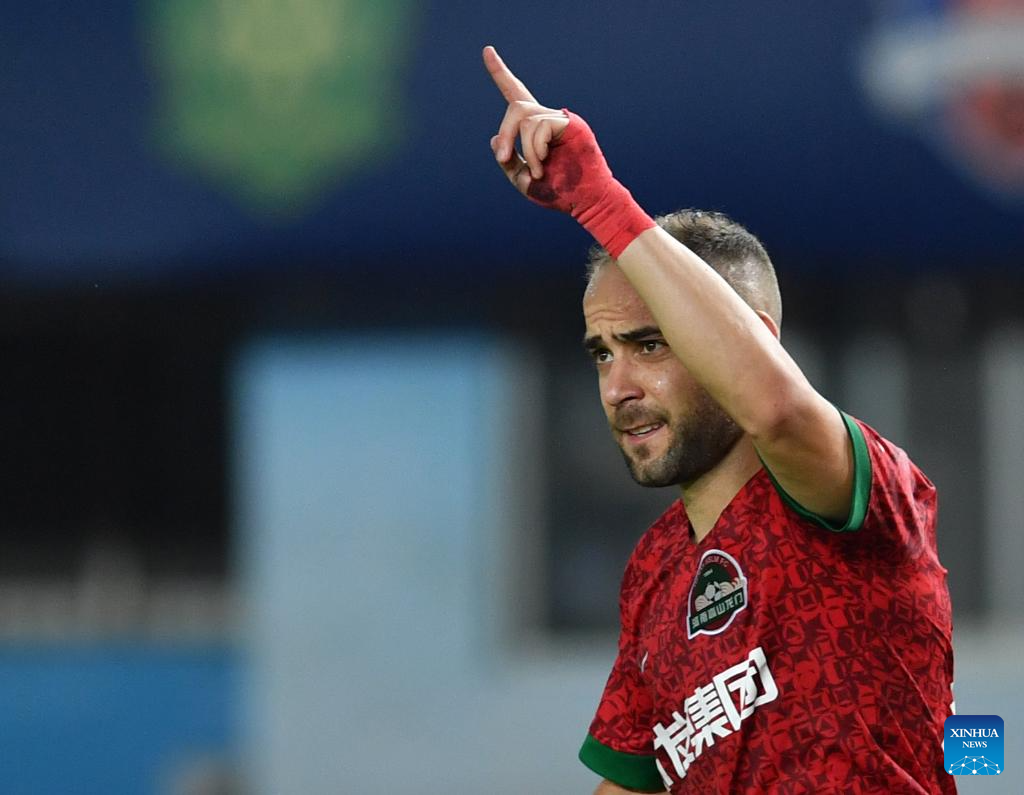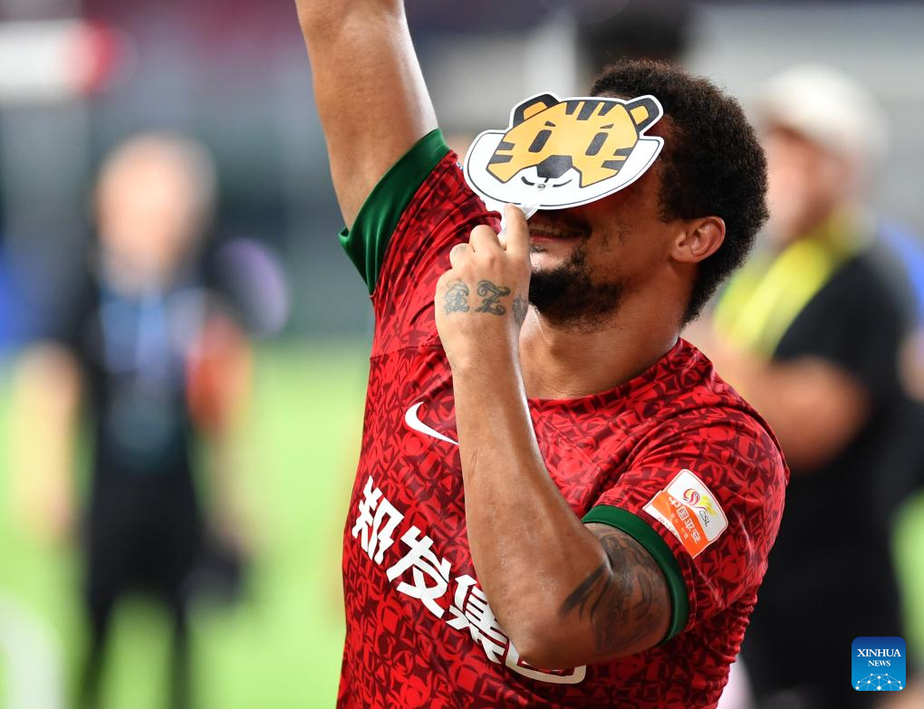 Hildeberto of Henan FC celebrates victory after a 2023 season Chinese Football Association Super League (CSL) match between Henan FC and Shanghai Port in Zhengzhou, central China's Henan Province, Aug. 25, 2023. (Xinhua/Li Jianan)
