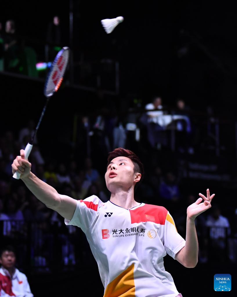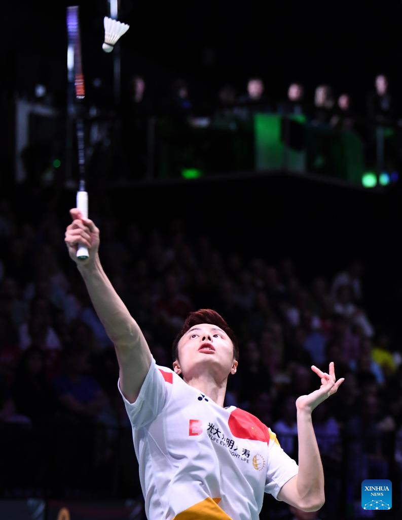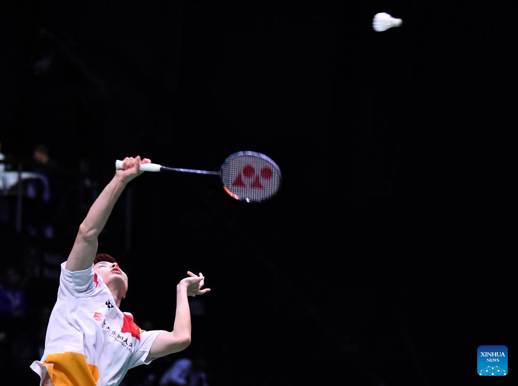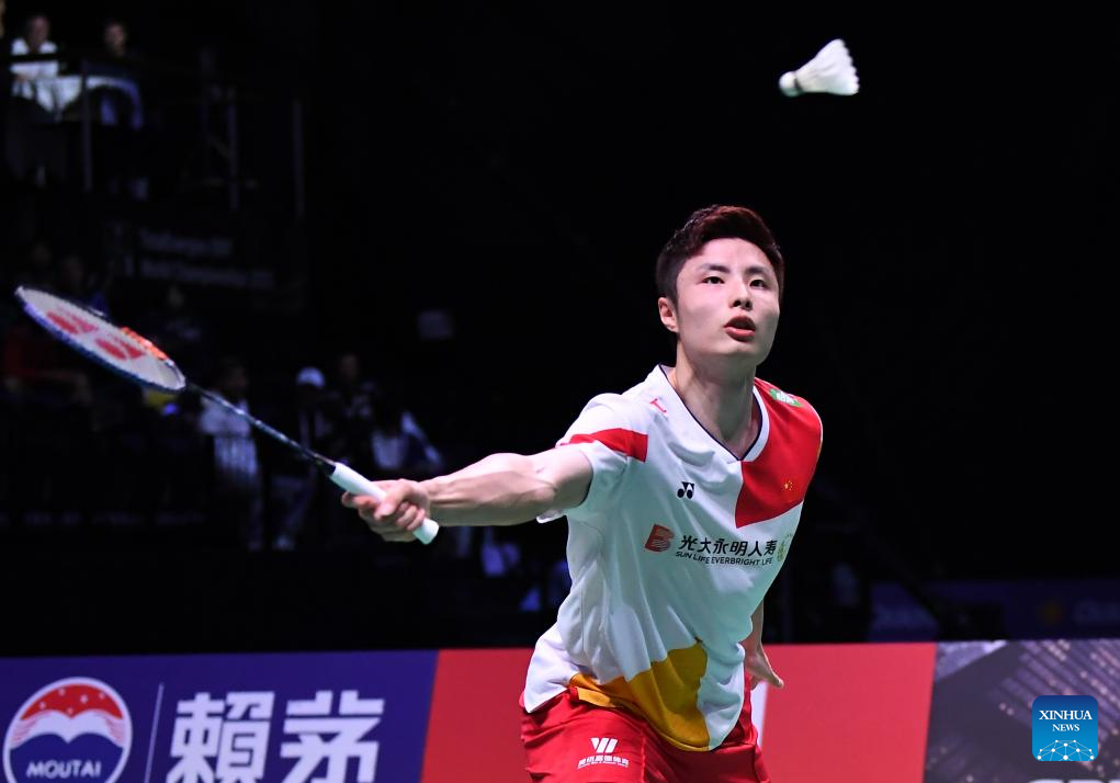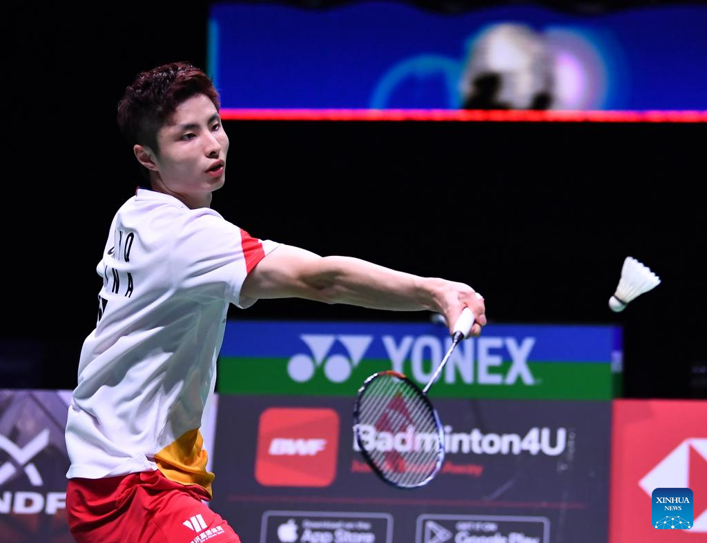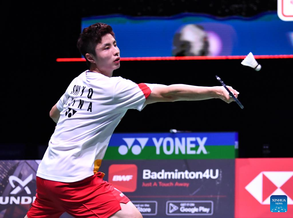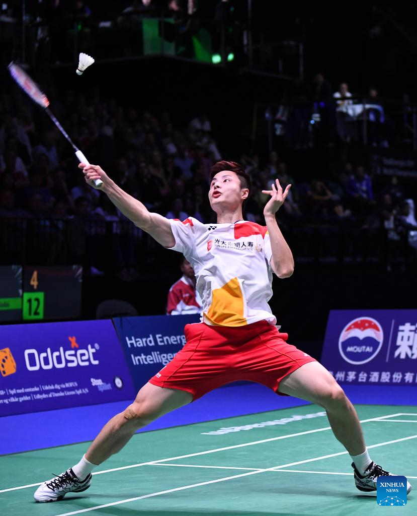 Shi Yuqi hits a return during the men's singles quarterfinal match between Shi Yuqi of China and Naraoka Kodai of Japan at the BWF World Championships 2023 in Copenhagen, Denmark, Aug. 25, 2023. (Xinhua/Ren Pengfei)