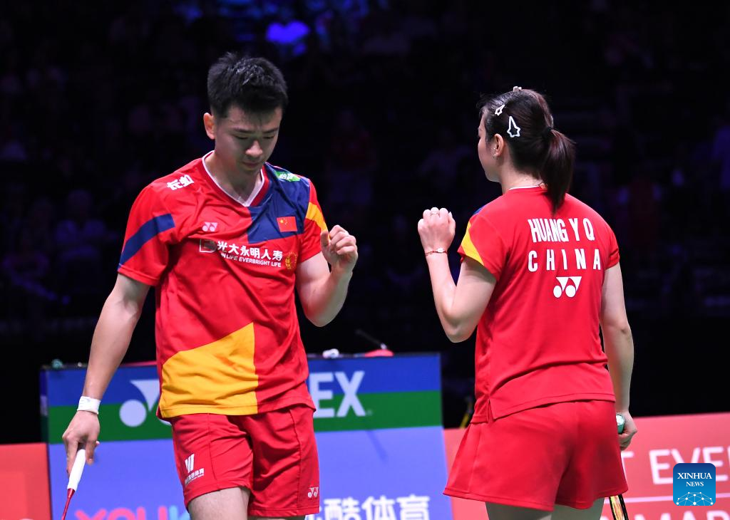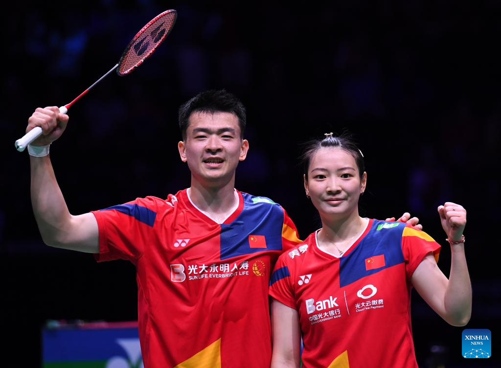 Zheng Siwei (L)/Huang Yaqiong of China pose after the mixed doubles semifinal match against Jiang Zhenbang/Wei Yaxin of China at the BWF World Championships 2023 in Copenhagen, Denmark, Aug. 26, 2023. (Xinhua/Ren Pengfei)