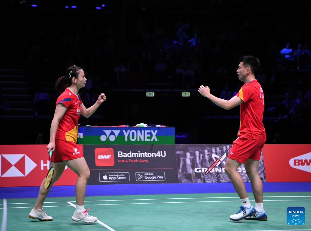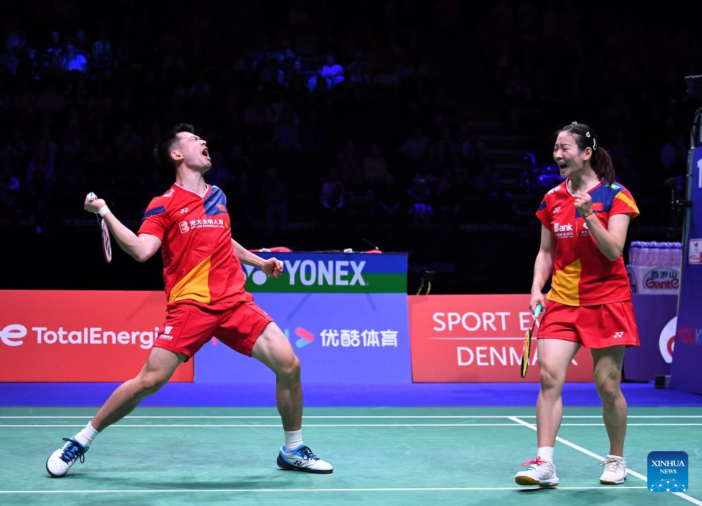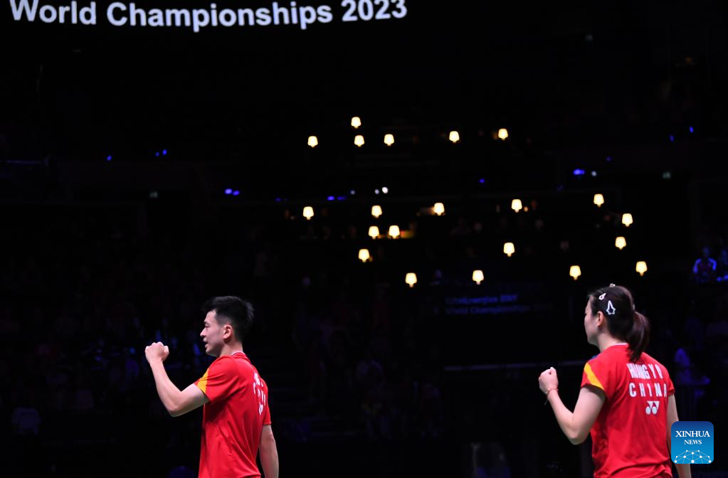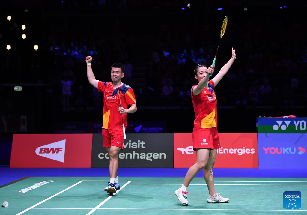 Zheng Siwei (L)/Huang Yaqiong of China celebrate during the mixed doubles semifinal match against Jiang Zhenbang/Wei Yaxin of China at the BWF World Championships 2023 in Copenhagen, Denmark, Aug. 26, 2023. (Xinhua/Ren Pengfei)