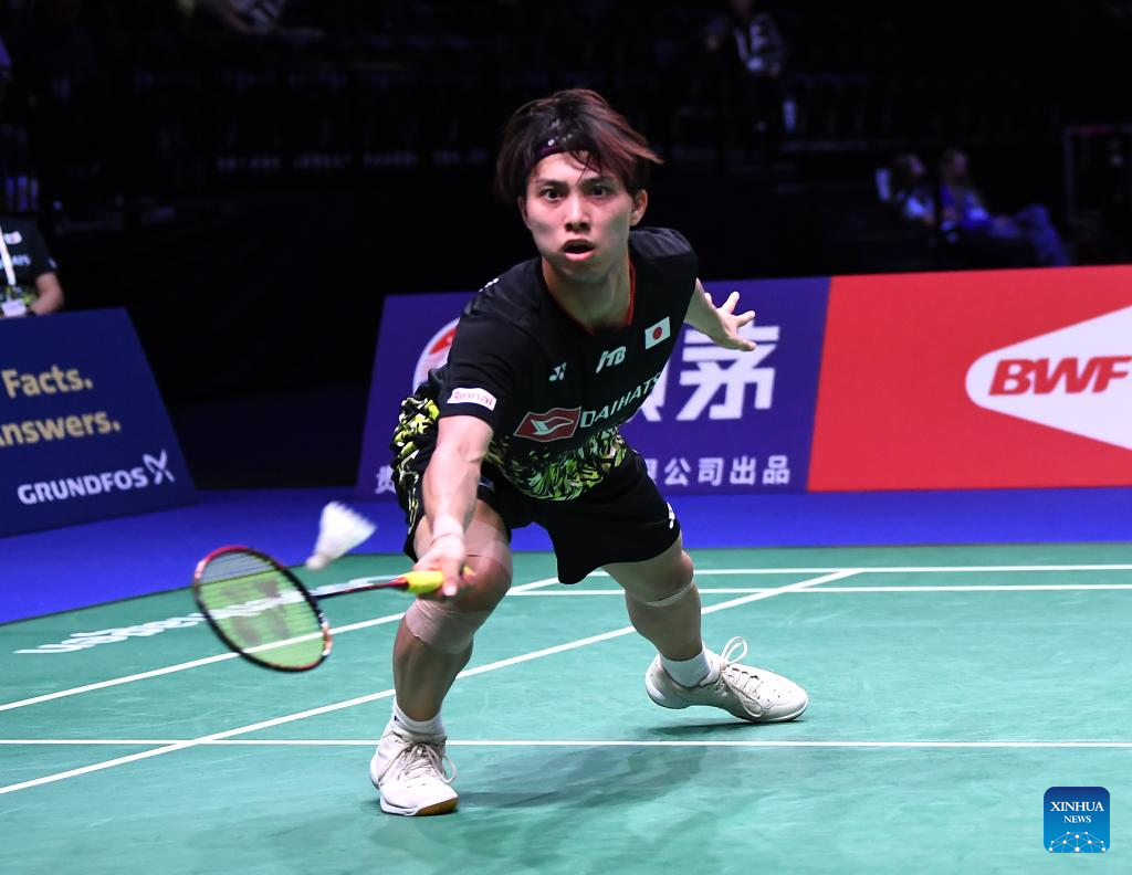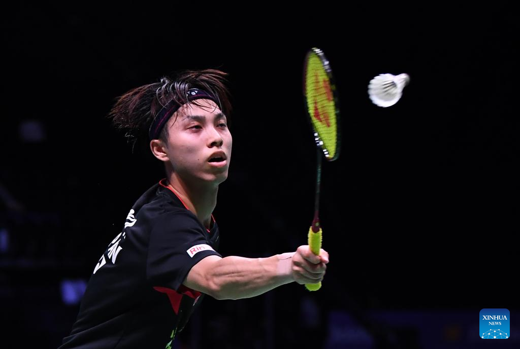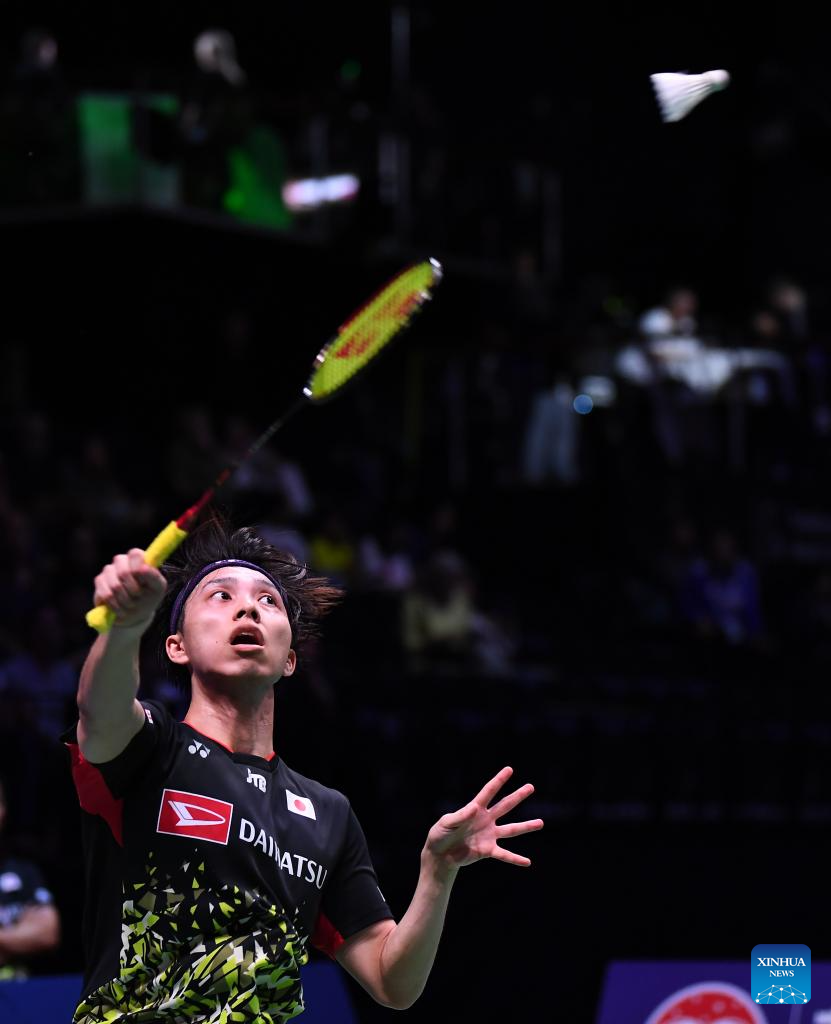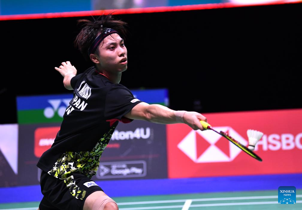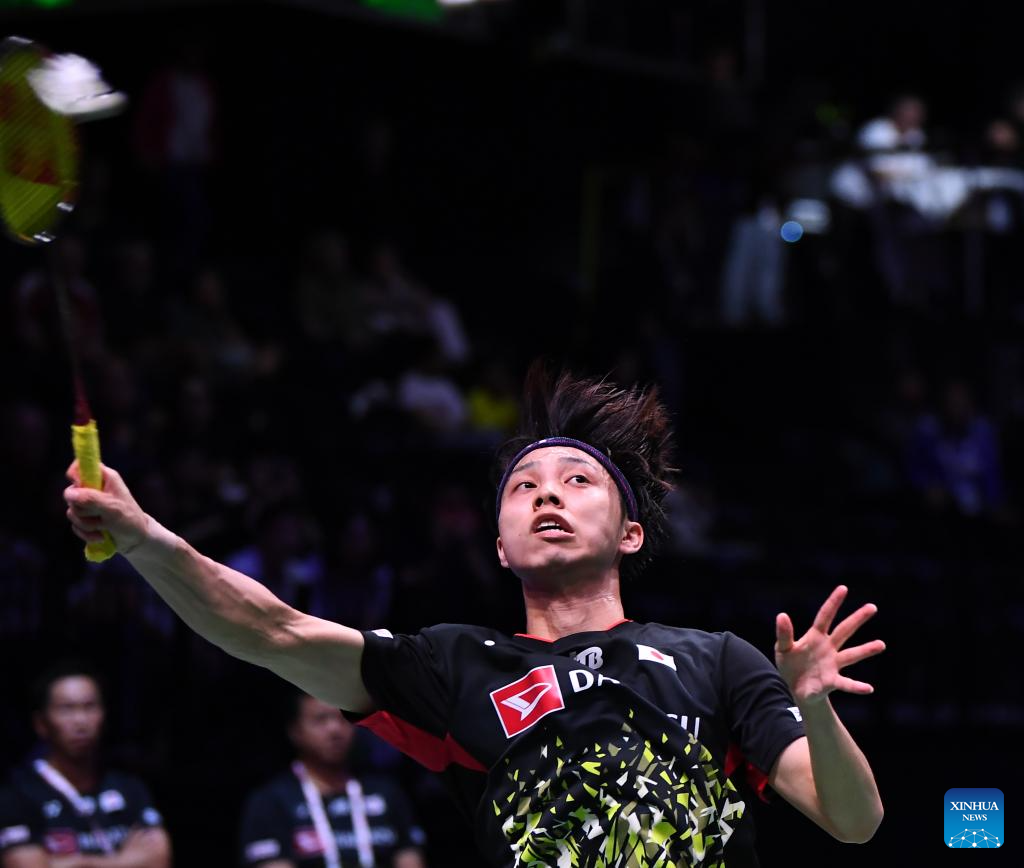 Naraoka Kodai hits a return during the men's singles quarterfinal match between Shi Yuqi of China and Naraoka Kodai of Japan at the BWF World Championships 2023 in Copenhagen, Denmark, Aug. 25, 2023. (Xinhua/Ren Pengfei)