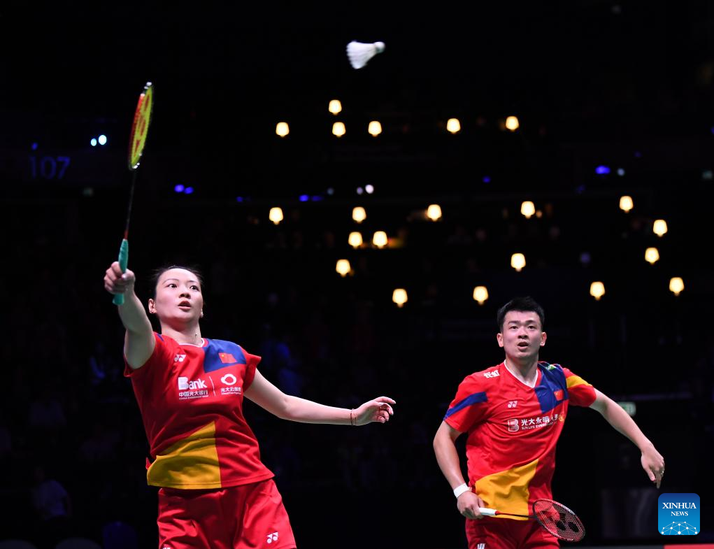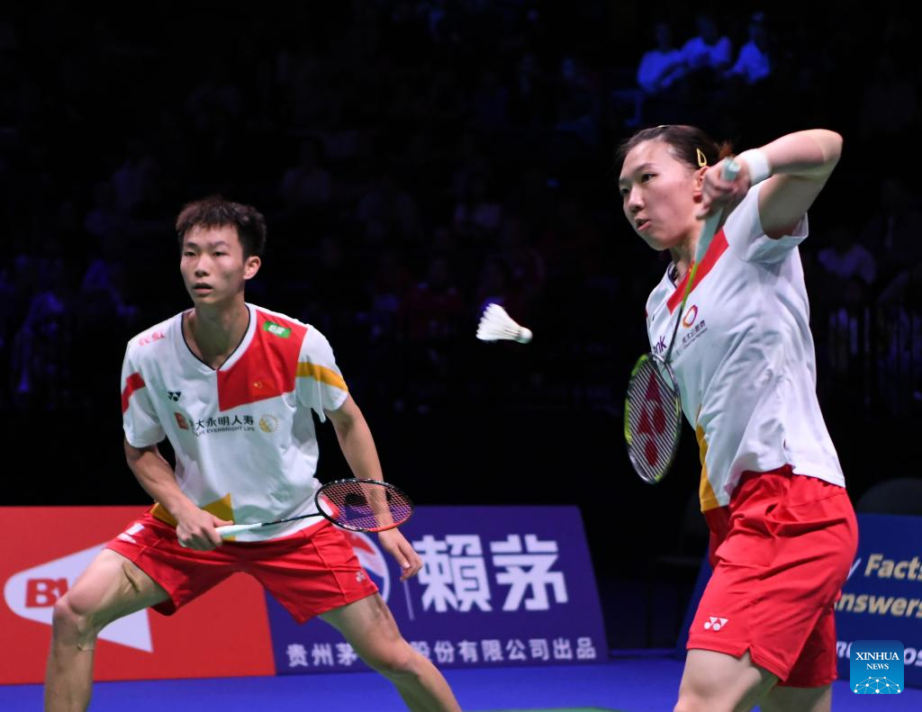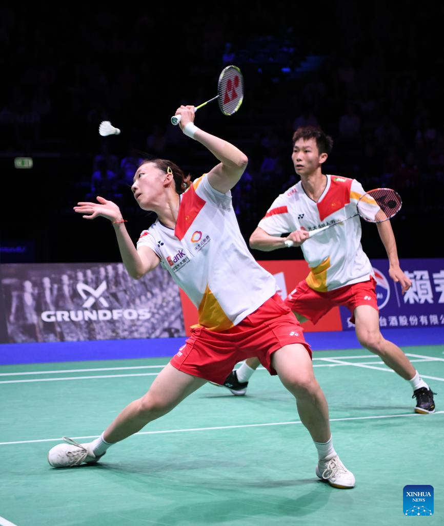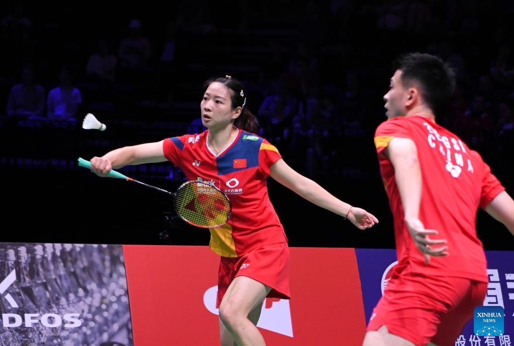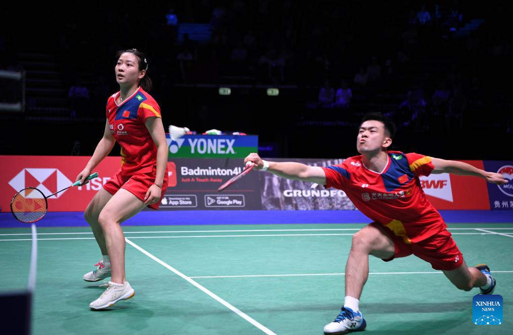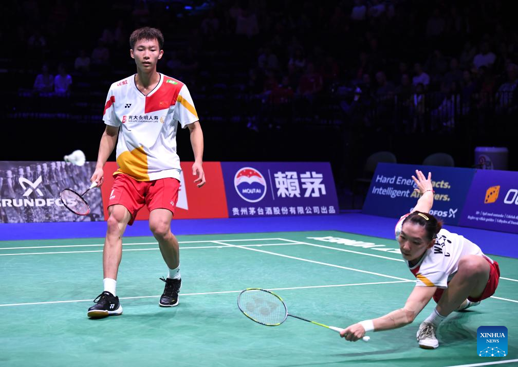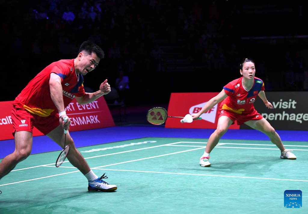 Zheng Siwei (L)/Huang Yaqiong of China compete during the mixed doubles semifinal match against Jiang Zhenbang/Wei Yaxin of China at the BWF World Championships 2023 in Copenhagen, Denmark, Aug. 26, 2023. (Xinhua/Ren Pengfei)