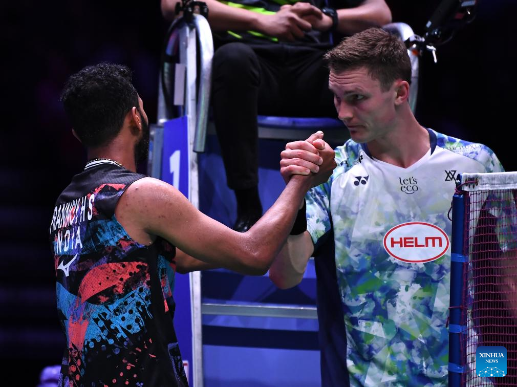 Viktor Axelsen (R) of Denmark greets Prannoy H.S. of India after their men's singles quarter final match at the BWF World Championships 2023 in Copenhagen, Denmark, Aug. 25, 2023. (Xinhua/Ren Pengfei)