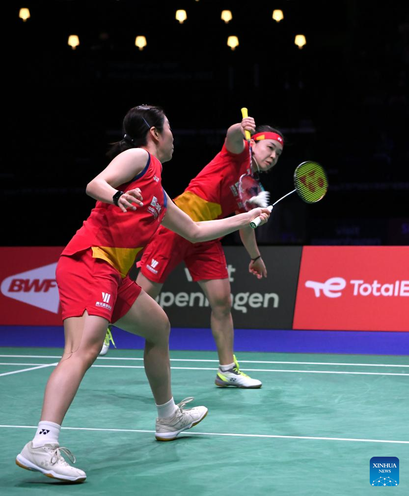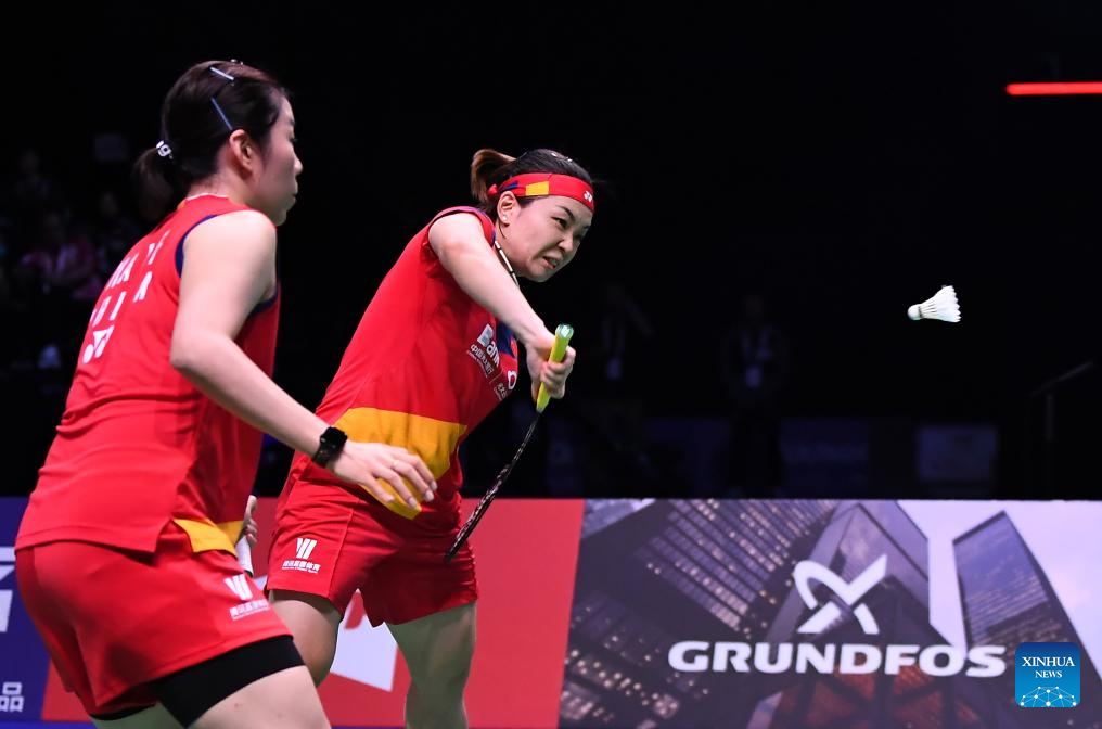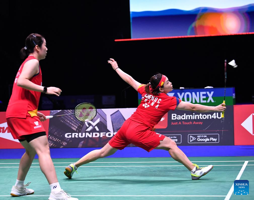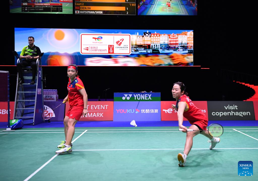 Chen Qingchen (R)/Jia Yifan of China compete during the women's doubles semifinal match against Zhang Shuxian/Zheng Yu of China at the BWF World Championships 2023 badminton tournament in Copenhagen, Denmark, Aug. 26, 2023. (Xinhua/Ren Pengfei)